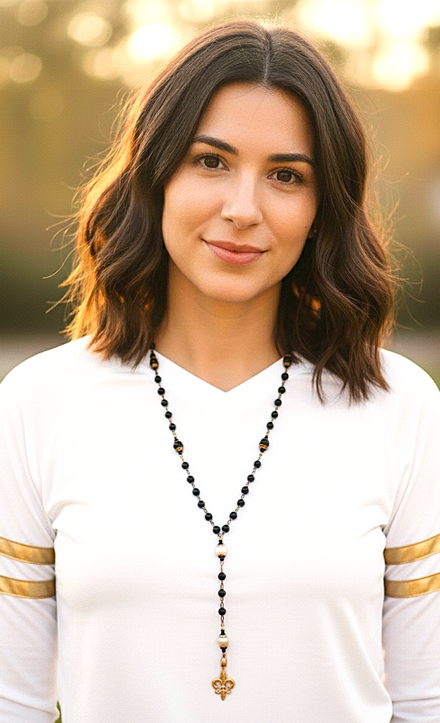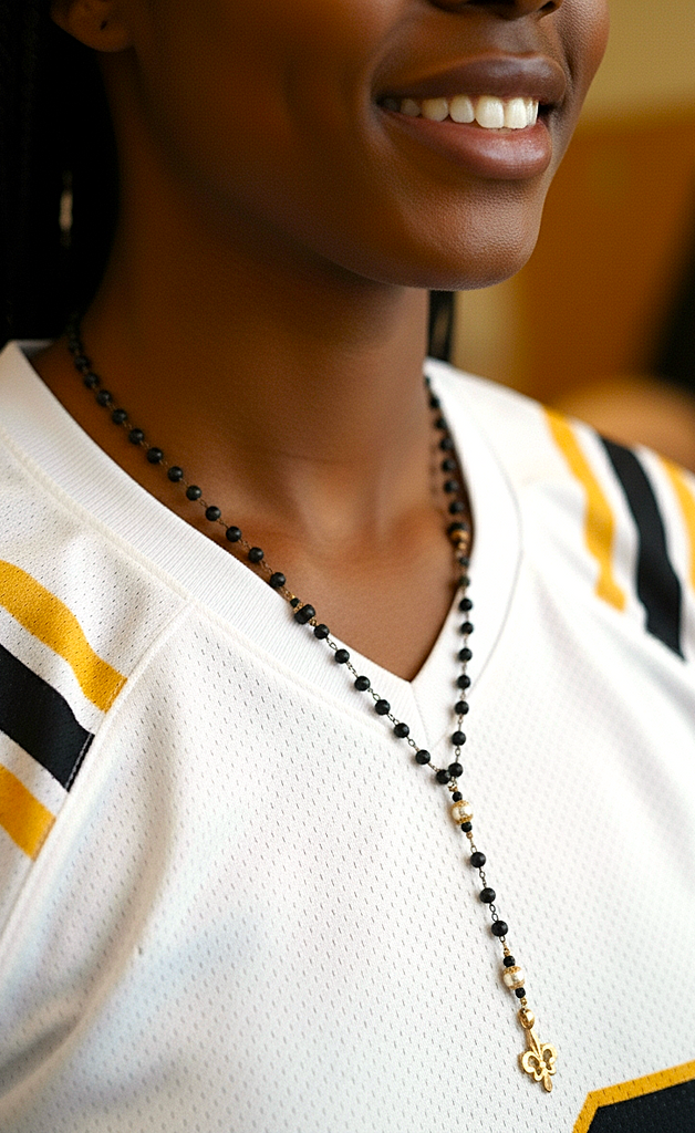 Gold plated fleur de lis on 7mm black onyx bead chain accented with 3mm gold plated bead and 4mm matte black onyx with gold plated filigree capped 8mm matte black onyx and Swarorski pearl