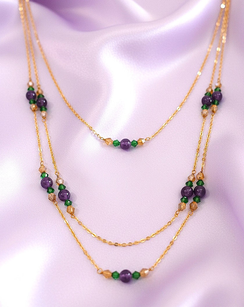 Gold plated chain layered necklace w/ Amethyst, Swarovski crystal accents