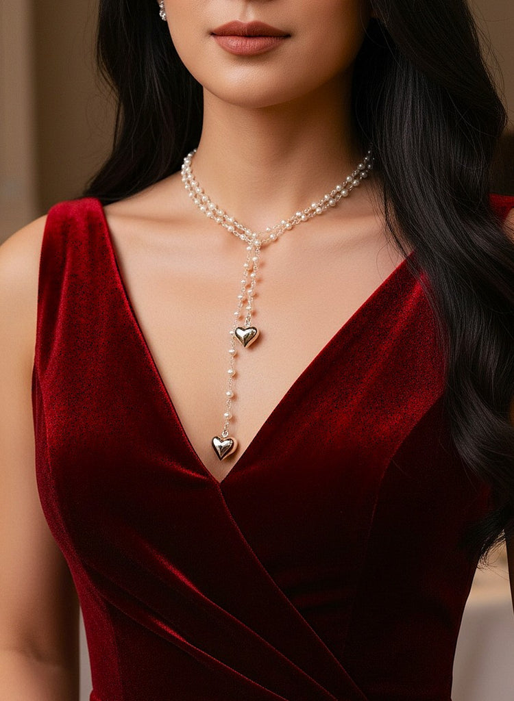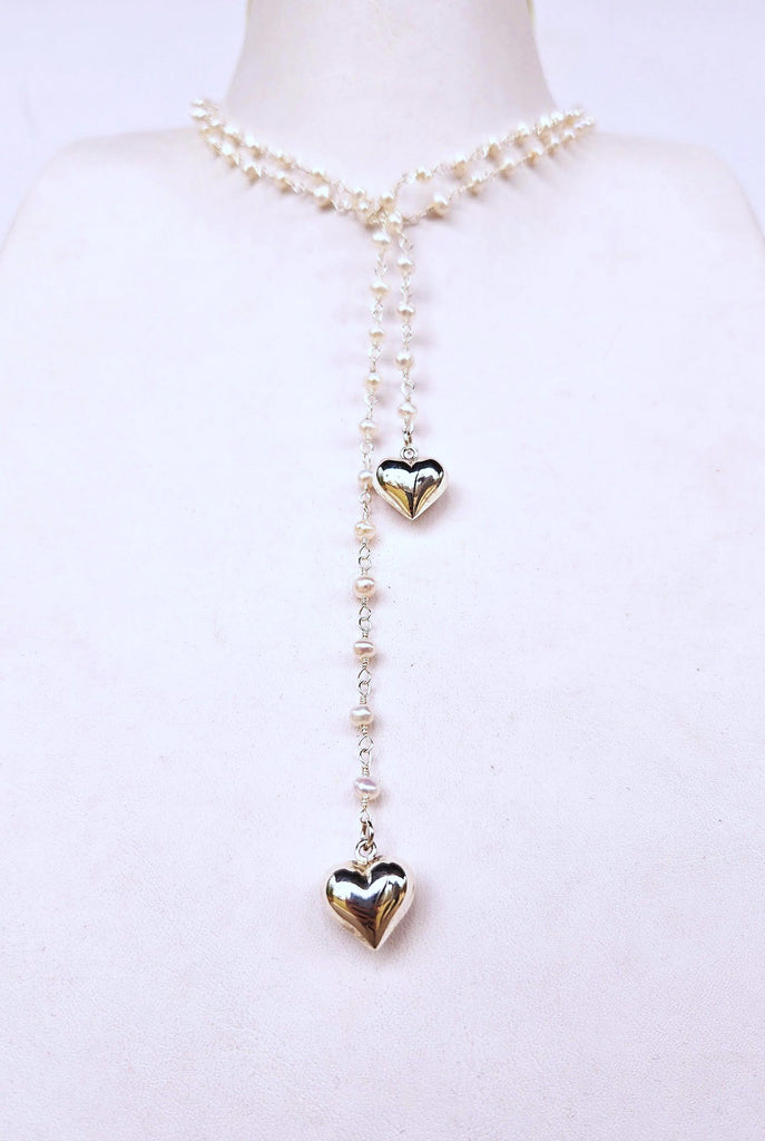 Sterling Silver Heart pendant on Freshwater Pearl Lariat necklace. Can be worn 3 different ways. Handmade original design, 44' inches long